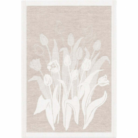Handduk Belle pryds av en ljus tulpanbukett som ger köket en mjuk och vårinspirerad känsla. Det vita mönstret mot den beige botten skapar ett lugnt uttryck som passar både i det lantliga och det mer moderna hemmet.