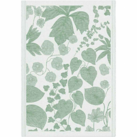En ekologiskt vävd handduk med gröna blad mot vit bakgrund i mjuka färger. Tillverkad i Sverige av bomull och lin med rötter i svensk tradition och textilt hantverk.