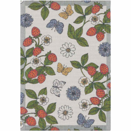 Handduk Maja bjuder in sommaren i köket med sitt mönster av smultron, blomster och fjärilar mot en mjuk grå bakgrund. Färgerna ger liv åt rummet och skapar en varm, vardagsnära känsla vid diskbänken eller det dukade bordet.