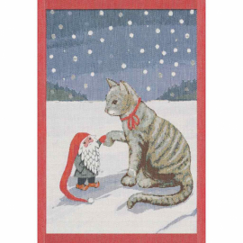 Bjud in den svenska julens charm med Ekelund handduk Vintervänner, ett hjärtevärmande motiv designat av Maria Ohlsson. Här möts en liten tomte och en nyfiken katt i en vintrig scen.
