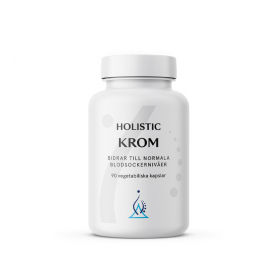 Krom är ett spårämne som kroppen behöver i små mängder och som finns naturligt i bland annat broccoli, tomat, spenat, gröna och gula ärtor, sojabönor, mörk choklad, valnötter, champinjoner, aprikos och kött. Holistic Krom innehåller krom i lättupptaglig form och är framtaget för att komplettera en varierad kost.