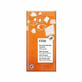 Ljus Choklad Karamell & Inkasalt EKO, 80 g från Vivani är en ekologisk mjölkchokladkaka. Produkten innehåller 44 % kakao samt kokosblomssocker, karamellkrisp och rosa incasalt från Peru.