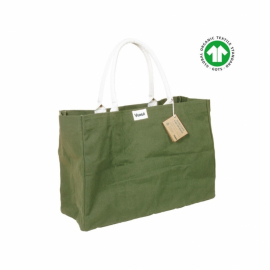 Skogsgrön ekologisk tygkasse i kraftig bomullscanvas från VENGA. Praktisk, certifierad och hållbar design för vardagen.