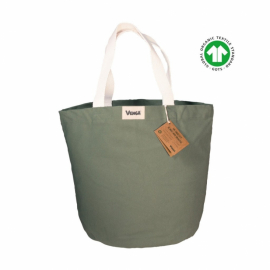 Skogsgrön ekologisk cylinderformad tygkasse från VENGA. Tjock canvas, rund botten och innerficka med karborre – praktisk och elegant.